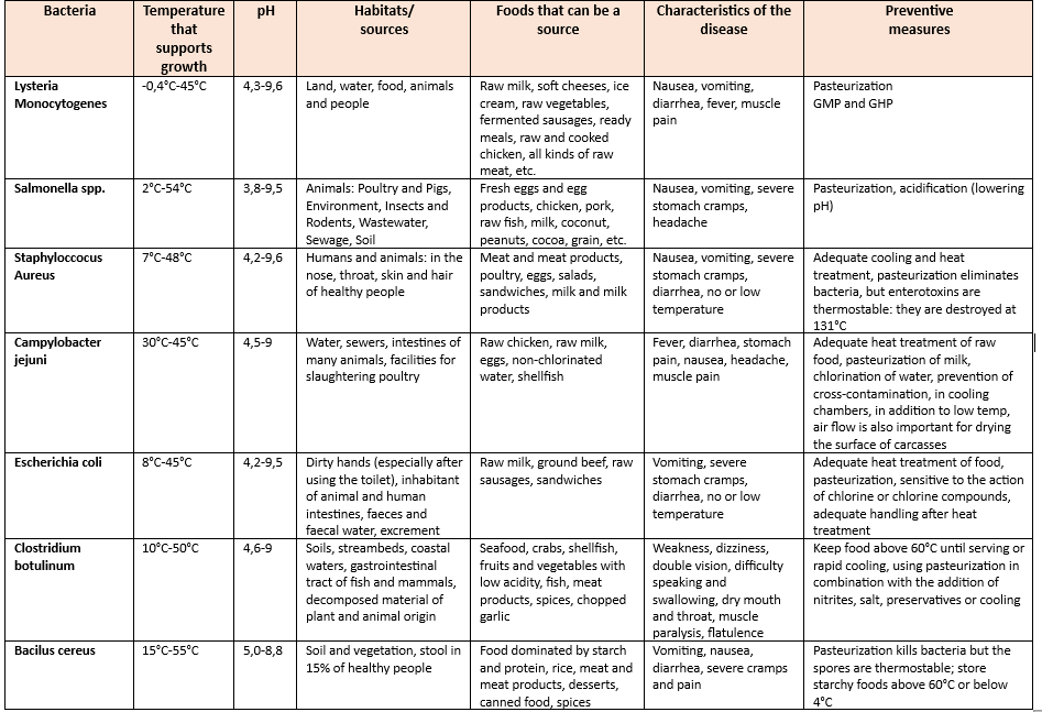 Below is an overview of pathogenic bacteria, the most common causes of foodborne diseases, as well as the conditions for their growth and development, the foods in which they are most commonly found, and preventive measures to avoid infection.