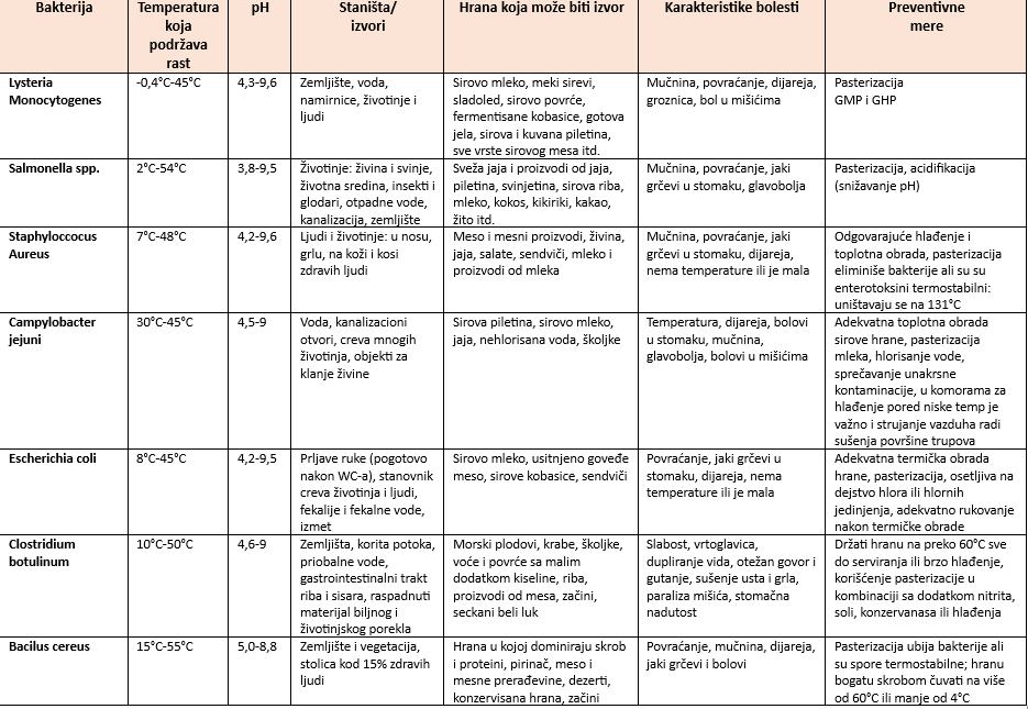 U prilogu je pregled patogenih bakterija, najčešćih uzročnika bolesti uzrokovanih hranom, kao i uslovi za njihov rast i razvoj, hrana u kojoj se najčešće mogu pronaći ali i preventivne mere da do zaražavanja ne bi došlo.